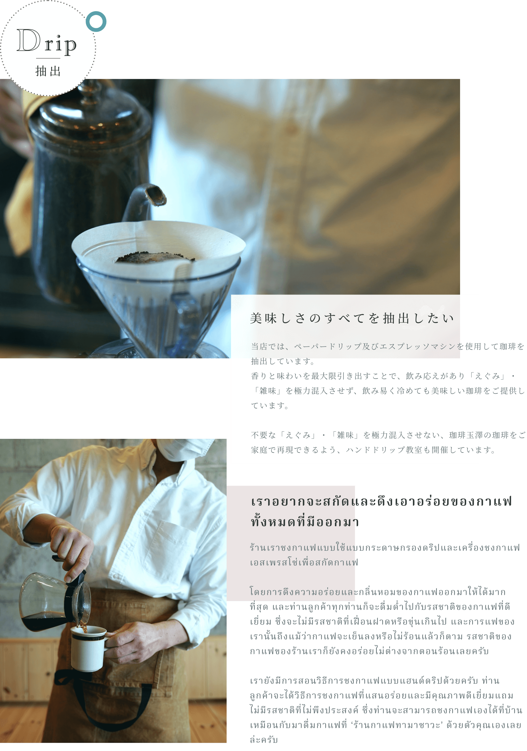 เรายังมีการสอนวิธีการชงกาแฟแบบแฮนด์ดริปด้วยครับ ท่านลูกค้าจะได้วิธีการชงกาแฟที่แสนอร่อยและมีคุณภาพดีเยี่ยมแถมไม่มีรสชาติที่ไม่พึงประสงค์ ซึ่งท่านจะสามารถชงกาแฟเองได้ที่บ้านเหมือนกับมาดื่มกาแฟที่ 'ร้านกาแฟทามาซาวะ' ด้วยตัวคุณเองเลยล่ะครับ