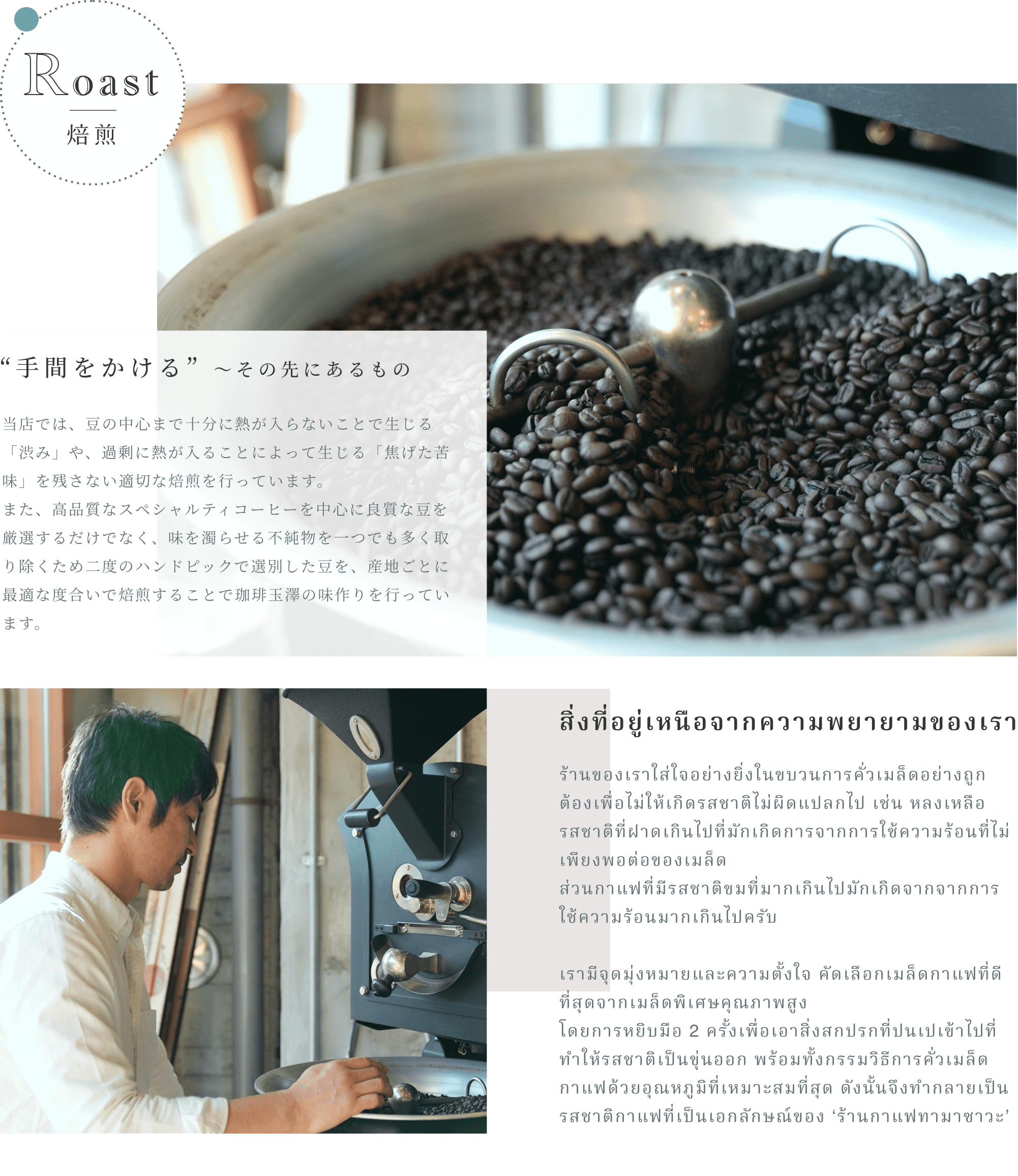 ร้านของเราใส่ใจอย่างยิ่งในขบวนการคั่วเมล็ดอย่างถูกต้องเพื่อไม่ให้เกิดรสชาติไม่ผิดแปลกไป เช่น หลงเหลือรสชาติที่ฝาดเกินไปที่มักเกิดการจากการใช้ความร้อนที่ไม่เพียงพอต่อของเมล็ด